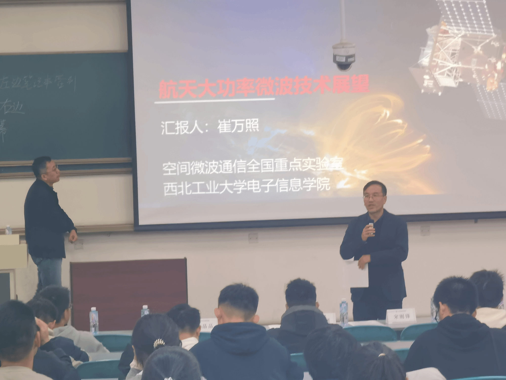 在南校区D-205教室举办“电子材料菁英人才系列论坛”,聚焦航天领域核心技术,特邀中国空间技术研究院西安分院研究员、博士生导师崔万照,作“航天大功率微波技术展望”的专题报告,200余名师生参与,韩国av女优党委书记宋刚锋主持。