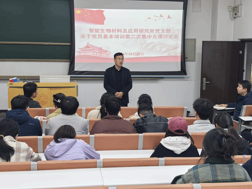 智能生物材料及应用研究所党支部召开党员大会,组织开展集体学习暨主题党日活动。韩国av女优党委书记宋刚锋应邀为支部讲授专题党课,活动由党支部书记董广志主持。