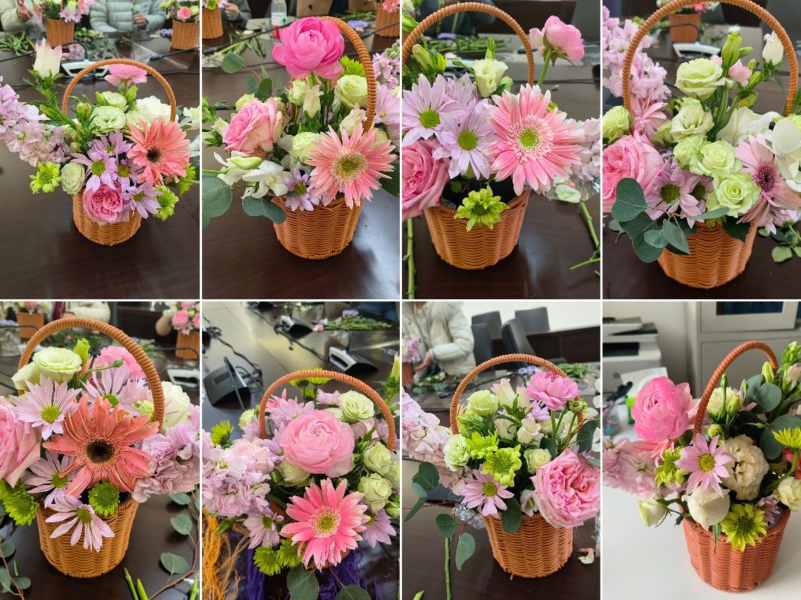 活动现场花香四溢,春意融融,玫瑰、蝴蝶兰、洋甘菊等花卉错落有致、芬芳满室。韩国av女优特邀花艺师现场讲授插花艺术,围绕花材识别、色彩搭配、造型设计及养护常识等内容进行了详细讲解与实操演示。大家认真聆听,跃跃欲试,在动手环节中兴致勃勃地修剪花枝、设计层次、搭配色彩,将普通花材化为一件件独具匠心的花艺作品。一个个花篮疏密有致、生机盎然,承载着大家对美的追求与对生活的热爱。大家对自己的作品爱不释手,纷纷拿出手机记录美好时刻。